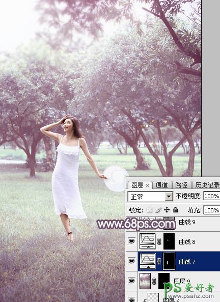 PS美女图片调色教程:给树林中自拍的唯美女生照片调出淡调紫红色