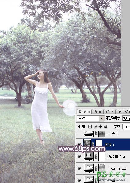 9、新建一个图层,按字母键“D”把前,背景颜色恢复到默认的黑白,然后选择菜单:滤镜 > 渲染 > 云彩,确定后把混合模式改为“滤色”,不透明度改为:30%,添加图层蒙版,用透明度较低的柔边黑色画笔把底部区域擦出来,效果如下图。这一步给图片增加烟雾效果。
