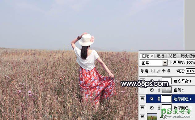 Photoshop给小清新唯美的草原女生写真图片调出清爽的青紫色效果
