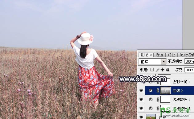 Photoshop给小清新唯美的草原女生写真图片调出清爽的青紫色效果