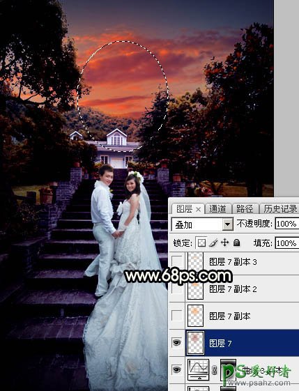 20、新建一个图层,用椭圆选框工具拉出下图所示的选区,羽化50个像素后填充红褐色:#B15A4D,取消选区后把混合模式改为“叠加”,效果如下图。