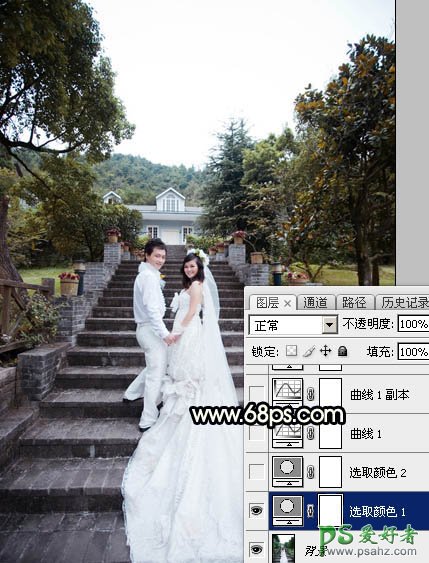 Photoshop给园林中拍摄的情侣婚纱照调出唯美梦幻温馨的霞光色彩,婚纱照素材图片天空泛白,画面比较平淡。我们通过后期美化调色让其变得更加漂亮,喜欢的朋友们可以好好学习一下。 原图 最终效果 1、打开原图素材大图,创建可选颜色调整图层,
