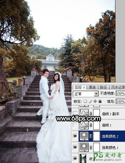 Photoshop给园林中拍摄的情侣婚纱照调出唯美梦幻温馨的霞光色彩,婚纱照素材图片天空泛白,画面比较平淡。我们通过后期美化调色让其变得更加漂亮,喜欢的朋友们可以好好学习一下。 原图 最终效果 1、打开原图素材大图,创建可选颜色调整图层,