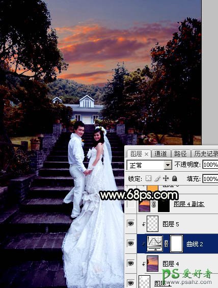 10、创建曲线调整图层,对RGB、绿、蓝通道进行调整,参数设置如图21 - 23,确定后创建剪切蒙版,效果如图24。这一步把天空部分稍微调暗一点,高光区域增加淡黄色。