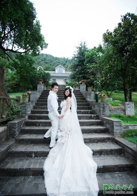 Photoshop给园林中拍摄的情侣婚纱照调出唯美梦幻温馨的霞光色彩