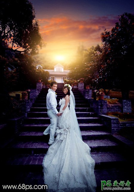 Photoshop给园林中拍摄的情侣婚纱照调出唯美梦幻温馨的霞光色彩,婚纱照素材