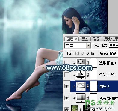 PS调色教程:给河边上自拍的清纯玉腿少女艺术照调出唯美的青蓝色