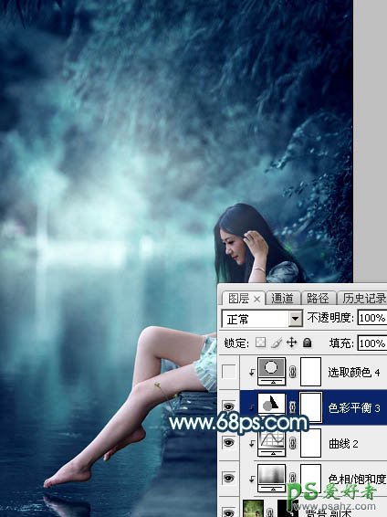 PS调色教程:给河边上自拍的清纯玉腿少女艺术照调出唯美的青蓝色