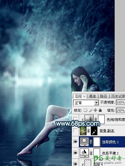 PS调色教程:给河边上自拍的清纯玉腿少女艺术照调出唯美的青蓝色