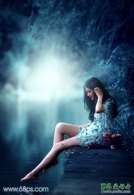 PS调色教程:给河边上自拍的清纯玉腿少女艺术照调出唯美的青蓝色,我们通过后期调色润色,让美女照片变得更加唯美梦幻,处理的时候先用调色工具把主色调成较为统一的青蓝色;最后再整体调一下高光,渲染即可,推荐给朋友们好好练习一下。
