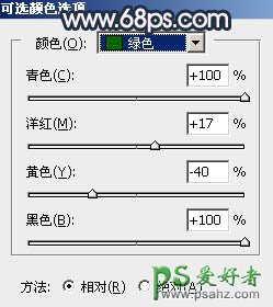 1、打开原图素材大图,创建可选颜色调整图层,对绿色进行调整,参数及效果如下图。这一步把图片中的绿色转为青色,并调暗一点。