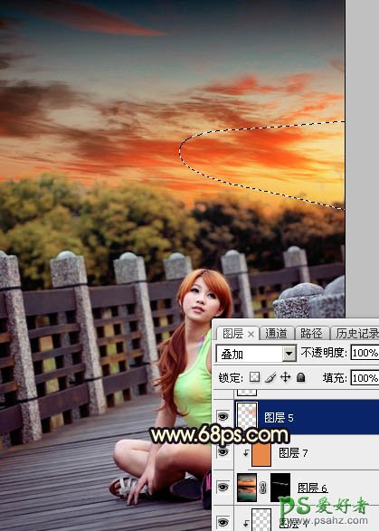 16、新建一个图层,用套索工具勾出下图所示的选区,羽化50个像素后填充橙红色:#E78948,取消选区后把混合模式改为“叠加”,如下图。