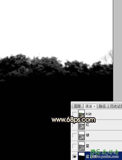 8、进入通道面板,把蓝色通道复制一份,得到蓝副本通道,然后用曲线或色阶工具增大明暗对比,把天空调成白色,天空以下的部分调成黑色,确定后再用柔边黑色画笔把地面部分涂黑,树的顶部可以保留部分灰色,如下图。