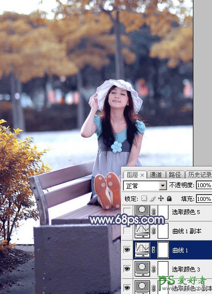 PS调色教程:给公园里小清新可爱女生照片调出清爽的秋季蓝橙色效