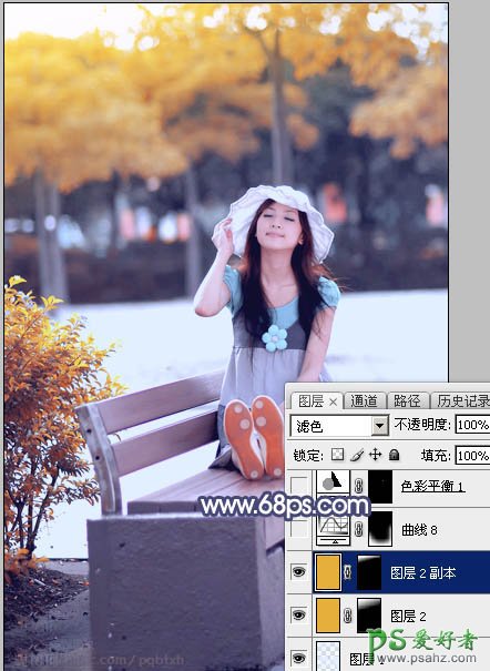 10、按Ctrl + J 把当前纯色调整图层复制一层,混合模式改为“滤色”,效果如下图。这两步给图片顶部增加橙黄色高光。