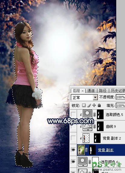 18、把背景图层复制一层,按Ctrl + Shift + ] 置顶,然后用钢笔工具把人物部分抠出来,转为选区后添加图层蒙版,效果如下图。