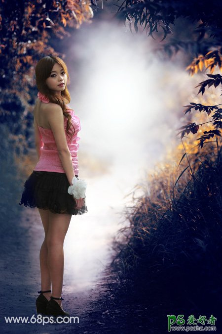 Photoshop给树林中自拍的性感美腿妹子写真照调出唯美的深秋暗蓝色,效果图调色分为两个部分:首先把主色转为秋季色,以橙黄色为主色;然后把整体大幅压暗,增加淡蓝色效果,最后再给整体人物柔化处理及微调细节部分,喜欢的朋友们好好学习一下吧!