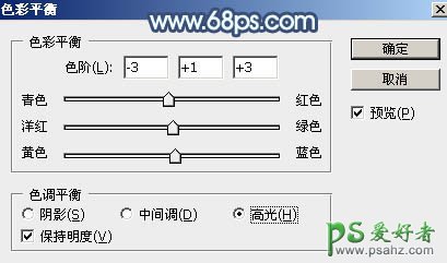 13、创建色彩平衡调整图层,对高光进行调整,参数设置如图34,确定后创建剪切蒙版,效果如图35。这一步给肤色高光区域增加淡蓝色。