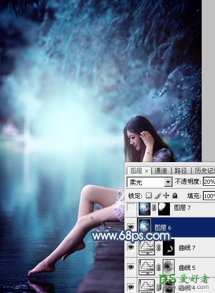 21、新建一个图层,按Ctrl + Alt + Shift + E 盖印图层。选择菜单:滤镜 > 模糊 > 动感模糊,角度设置为-45度,距离设置为150,确定后把混合模式改为“柔光”,不透明度改为:20%,效果如下图。这一步把图片柔化处理。
