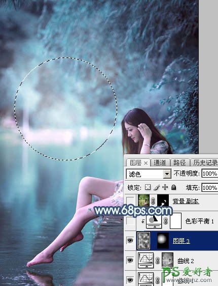 7、新建一个图层,按字母键“D”把前,背景颜色恢复到默认的黑白,然后选择菜单:滤镜 > 渲染 > 云彩,确定后把混合模式改为“滤色”。 按住Alt键添加图层蒙版,然后用透明度较低的柔边白色画笔把下图选区部分擦出来,控制好边缘过渡。这一步给图片中间区域增加烟雾效果,增加唯美度。