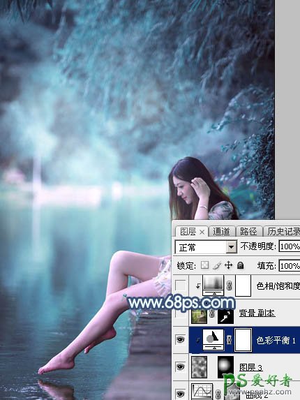 8、创建色彩平衡调整图层,对阴影,高光进行调整,参数设置如图20,21,确定后按Ctrl + Alt + G 创建剪切蒙版,效果如图22。这一步给云彩部分增加青蓝色。