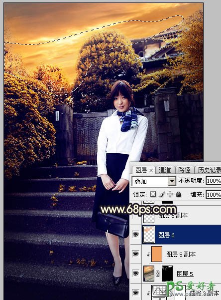 14、新建一个图层,用套索工具勾出下图所示的选区,羽化50个像素后填充橙黄色:#F1A263,取消选区后把混合模式改为“叠加”,效果如下图。