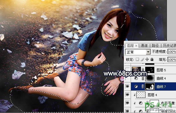 20、创建曲线调整图层,把RGB通道大幅压暗,确定后把蒙版填充黑色。然后用柔边白色画笔把边角区域擦出来,效果如图49。这一步给图片增加暗角。