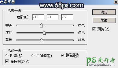 5、创建色彩平衡调整图层,对阴影,高光进行调整,参数设置如图14,15,确定后按Ctrl + Alt + G 创建剪切蒙版,效果如图16。这一步给图片暗部增加蓝色。