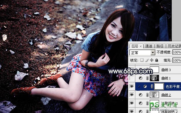 PS美女图片调色:给公园长凳边的雪白美腿女孩生活照调出秋季暖色