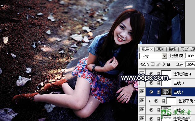 PS美女图片调色:给公园长凳边的雪白美腿女孩生活照调出秋季暖色