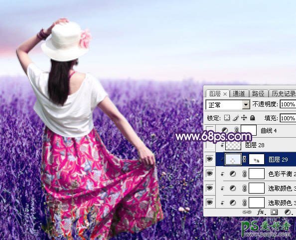 23、新建一个图层,创建剪切蒙版,把前景色设置为淡蓝色:#E9F1FC,然后用透明度较低柔边画笔给人物右侧边缘受光区域涂上前景色,效果如下图。