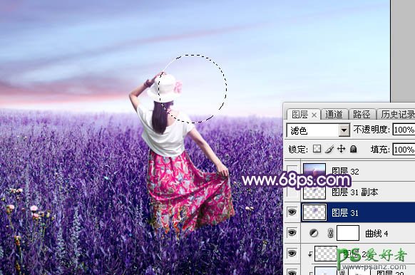 25、新建一个图层,用椭圆选框工具拉出下图所示的选区,羽化35个像素后填充蓝紫色:#7441A4,取消选区后把混合模式改为“滤色”,如下图。