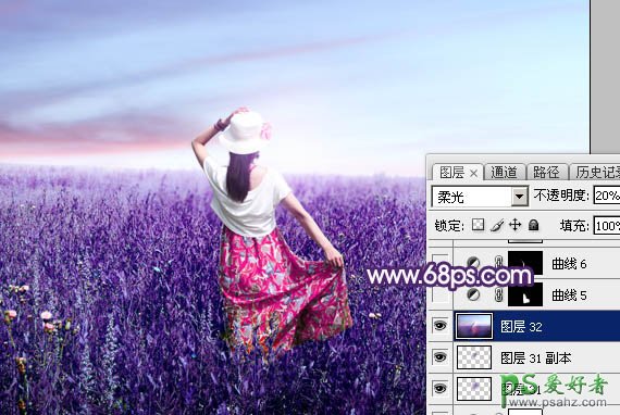 27、新建一个图层,按Ctrl + Alt + Shift + E 盖印图层。选择菜单:滤镜 > 模糊 > 动感模糊,角度设置为45度,距离设置为150,确定后把混合模式改为“柔光”,不透明度改为:20%,效果如下图。