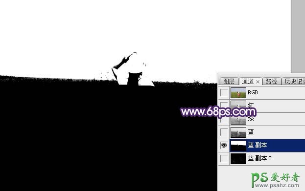 11、进入通道面板,把蓝色通道复制一份,得到蓝副本通道。按Ctrl + L 调整色阶,把暗部调暗,天空区域调白,如下图。然后用柔边黑色画笔把天空以外的区域涂黑。