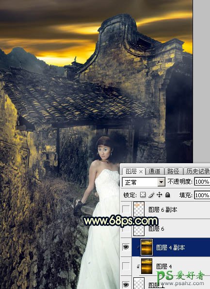 PS婚片调色:给残旧古建筑中的美腿高跟婚片美女调出唯美的霞光色