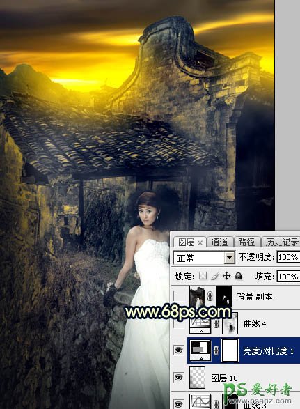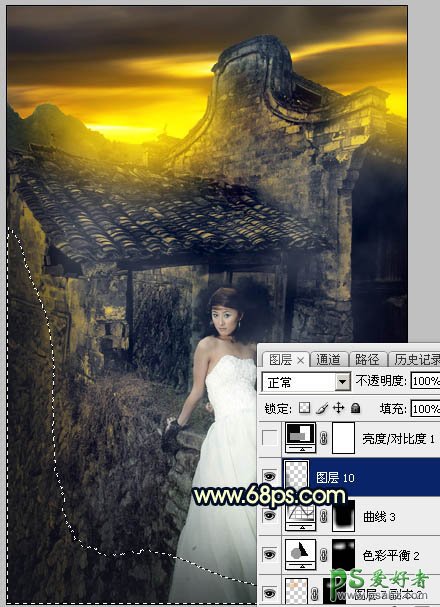 PS婚片调色:给残旧古建筑中的美腿高跟婚片美女调出唯美的霞光色