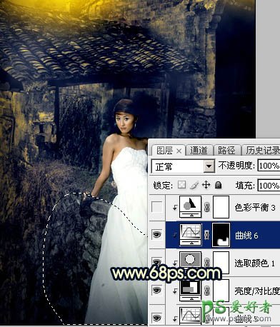 PS婚片调色:给残旧古建筑中的美腿高跟婚片美女调出唯美的霞光色