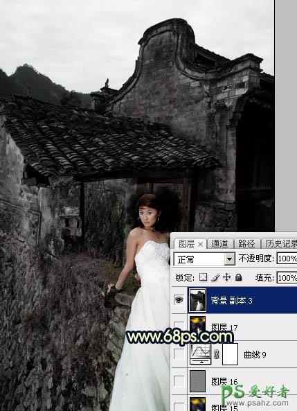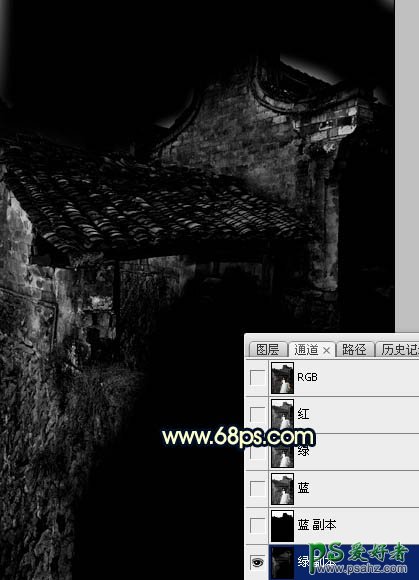 4、进入通道面板,把绿色通道复制一份,得到绿副本通道。先用柔边黑色画笔把绿副本通道中的天空及人物涂黑,然后按Ctrl + M 调整曲线,加强明暗对比,效果如下图。