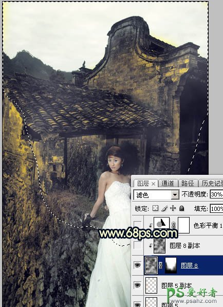 7、新建一个图层,按字母键“D”把前,背景颜色恢复到默认的黑白,然后选择菜单:滤镜 > 渲染 > 云彩,确定后把混合模式改为“滤色”,不透明度改为:30%。再按住Alt键添加图层蒙版,然后用柔边白色画笔把下图选区部分擦出来。这一步给建筑部分增加烟雾效果。