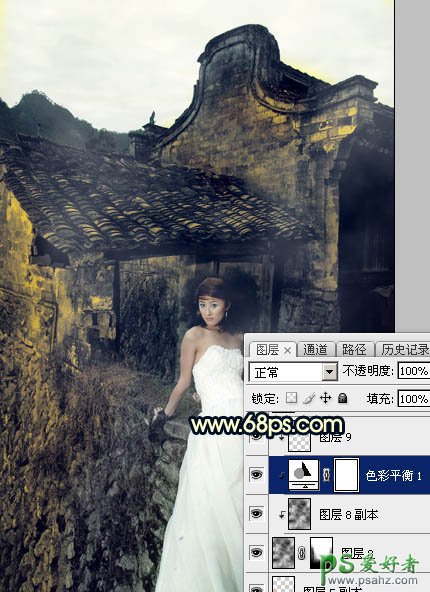PS婚片调色:给残旧古建筑中的美腿高跟婚片美女调出唯美的霞光色