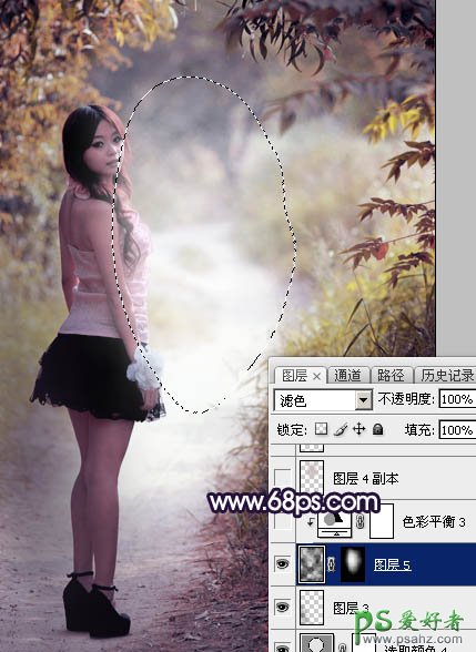 13、新建一个图层,按字母键“D”,把前,背景颜色恢复到默认的黑白。然后选择菜单:滤镜 > 渲染 > 云彩,确定后把混合模式改为“滤色”,再按住Alt键添加图层蒙版,用柔边白色画笔把下图选区部分擦出来。这一步给图片中间位置增加烟雾效果。