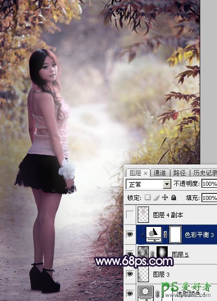 PS调色教程:给树林中自拍的可爱女孩生活照调出秋季蓝紫色