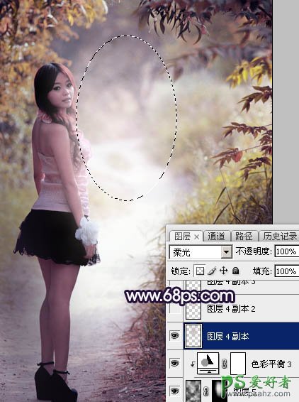 15、新建一个图层,用椭圆选框工具拉出下图所示的选区,羽化50个像素后填充红灰色:#C8BAB9,取消选区后把混合模式改为“柔光”,效果如下图。