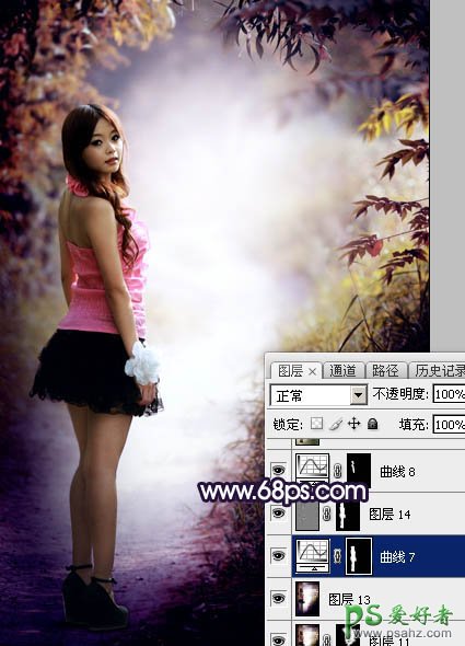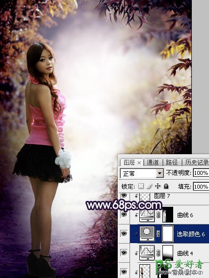 PS调色教程:给树林中自拍的可爱女孩生活照调出秋季蓝紫色