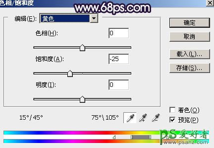 3、创建色相/饱和度调整图层,对黄色,绿色进行调整,参数及效果如下图。这一步降低黄色饱和度,把绿色转为黄褐色。