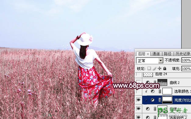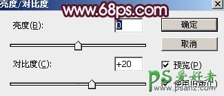 4、创建亮度/对比度调整图层,适当增加对比度,参数设置如图20,确定后用透明度较低柔边黑色画笔把底部区域擦出来。然后再按Ctrl + Alt + G 创建剪切蒙版,效果如图12。这一步主要增加草地顶部区域对比度。