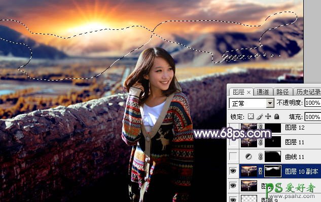 25、新建一个图层,按Ctrl + Alt + Shift + E 盖印图层,用模糊工具把下图选区部分模糊处理。
