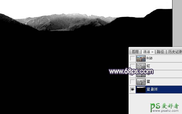 8、进入通道面板,把蓝色通道复制一份,得到蓝副本通道。按Ctrl + M 调整曲线,把天空调成白色,其它区域调暗。确定后再用柔边黑色画笔把天空以外的部分涂黑,中间的山峰顶部可以保留部分灰色,这样有利于增加天空素材的时候更好的融合,如下图。