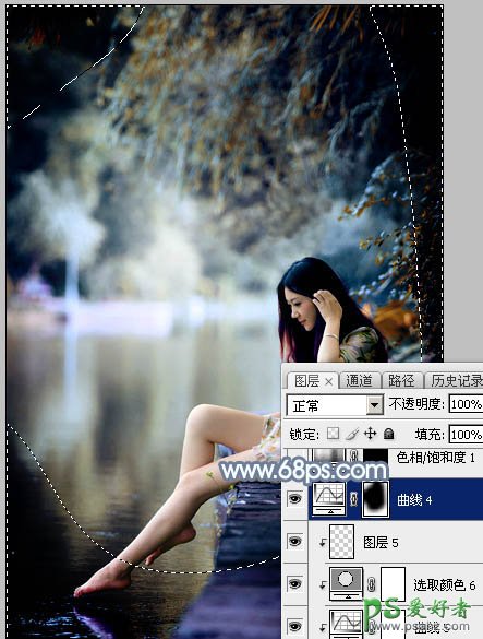 15、创建曲线调整图层,对RGB通道进行调整,参数设置如图37,确定后把蒙版填充黑色,然后用柔边白色画笔把边角区域擦出来,效果如图38。这一步给图片增加暗角。