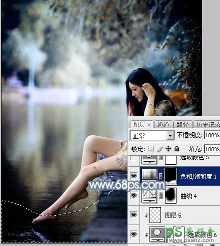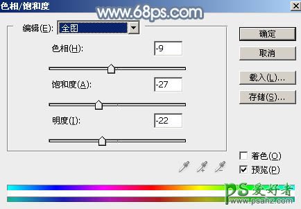16、创建色相/饱和度调整图层,对全图进行调整,参数设置如图39,确定后把蒙版填充黑色,然后用柔边白色画笔把底部过亮的区域涂暗,效果如图40。